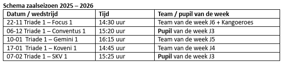 Aankomend zaalseizoen willen we weer diverse keren het ‘team van de week’ organiseren. Het team van de week mag oplopen met Triade 1, de mascotte en krijgt daarna een oorkonde en iets lekkers om te snoepen tijdens het aanmoedigen van Triade 1 bij de wedstrijd. De teams die in aanmerking komen voor ‘team van de week’ zijn de Kangoeroes, J6, J5 en J4. De wedstrijden dat er geen team van de week is, zal er een pupil van de week worden gekozen. De pupil van de week mag mee tijdens de wedstrijdbespreking, de bal uitnemen tijdens de wedstrijd van Triade 1 en proberen te scoren. Ook krijgt deze pupil een oorkonde en iets lekkers.